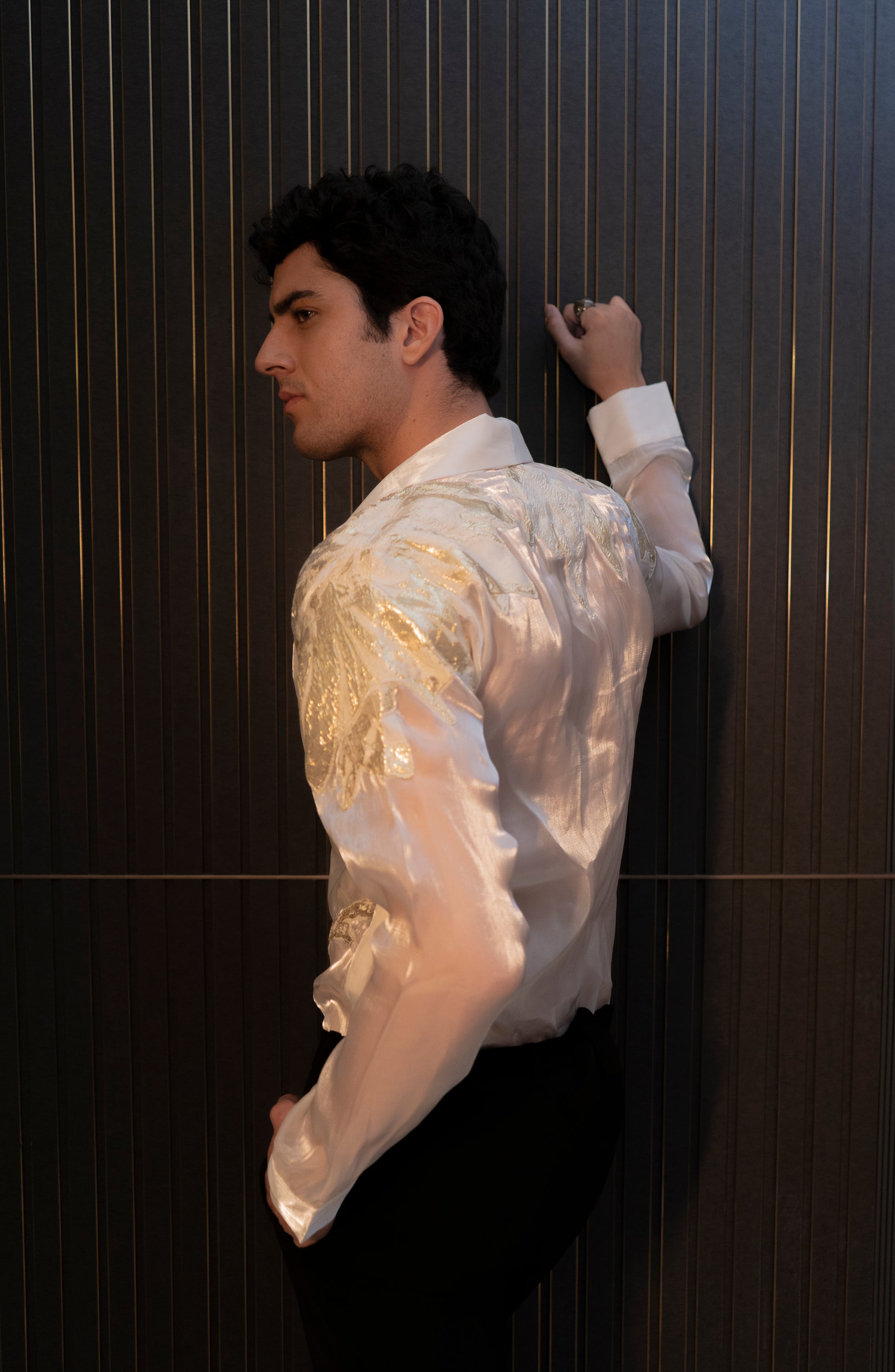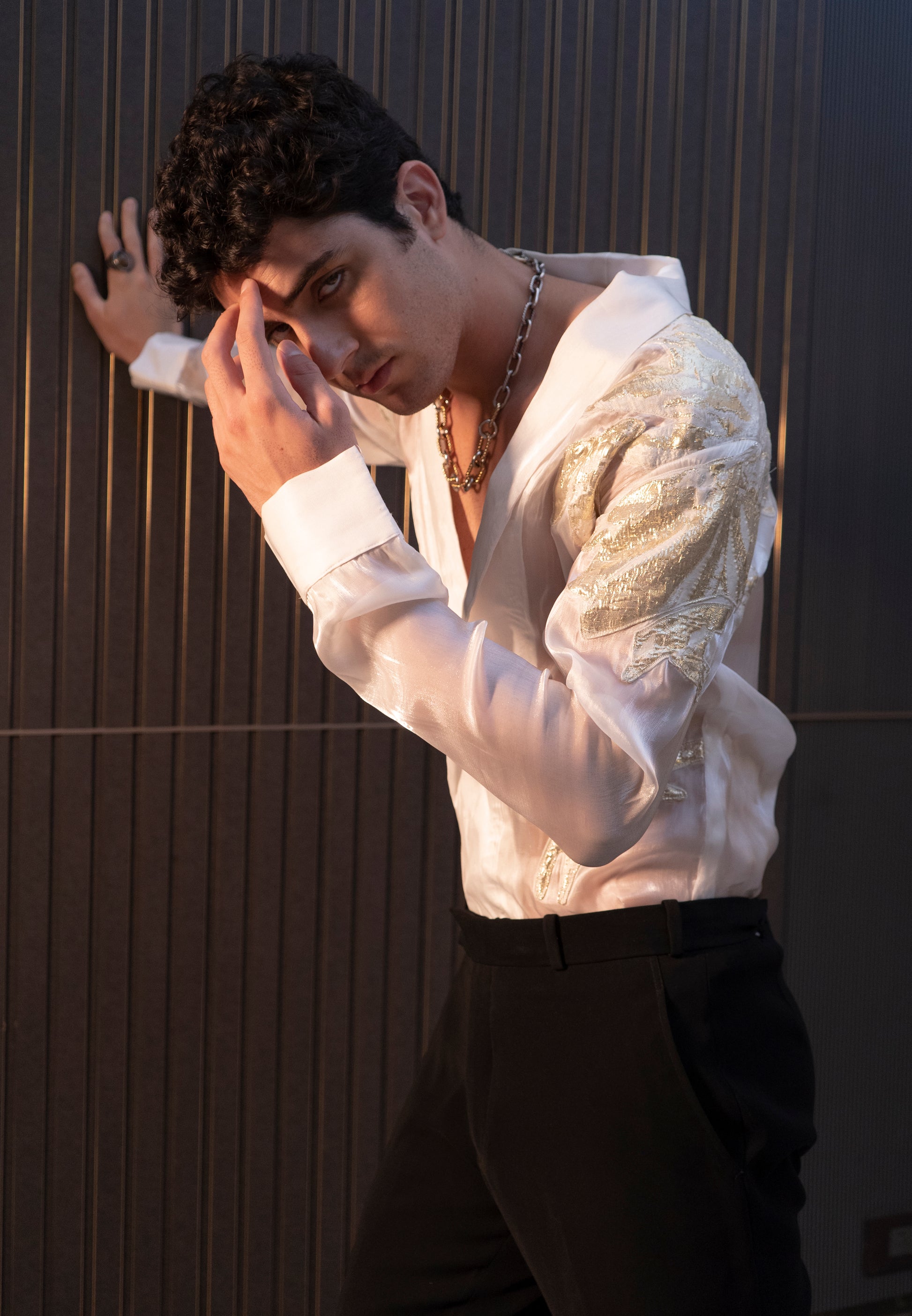 The Celestia Shirt is a statement of elegance and modern artistry. Made from premium white organza, it features intricate jacquard patches that add texture and a subtle luxe appeal. Lightweight and airy, this shirt drapes beautifully, making it perfect for parties, evening events, and special occasions.