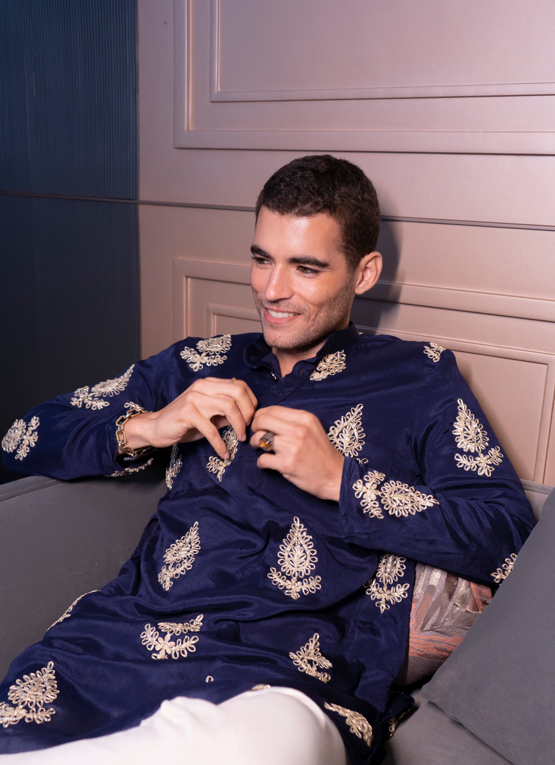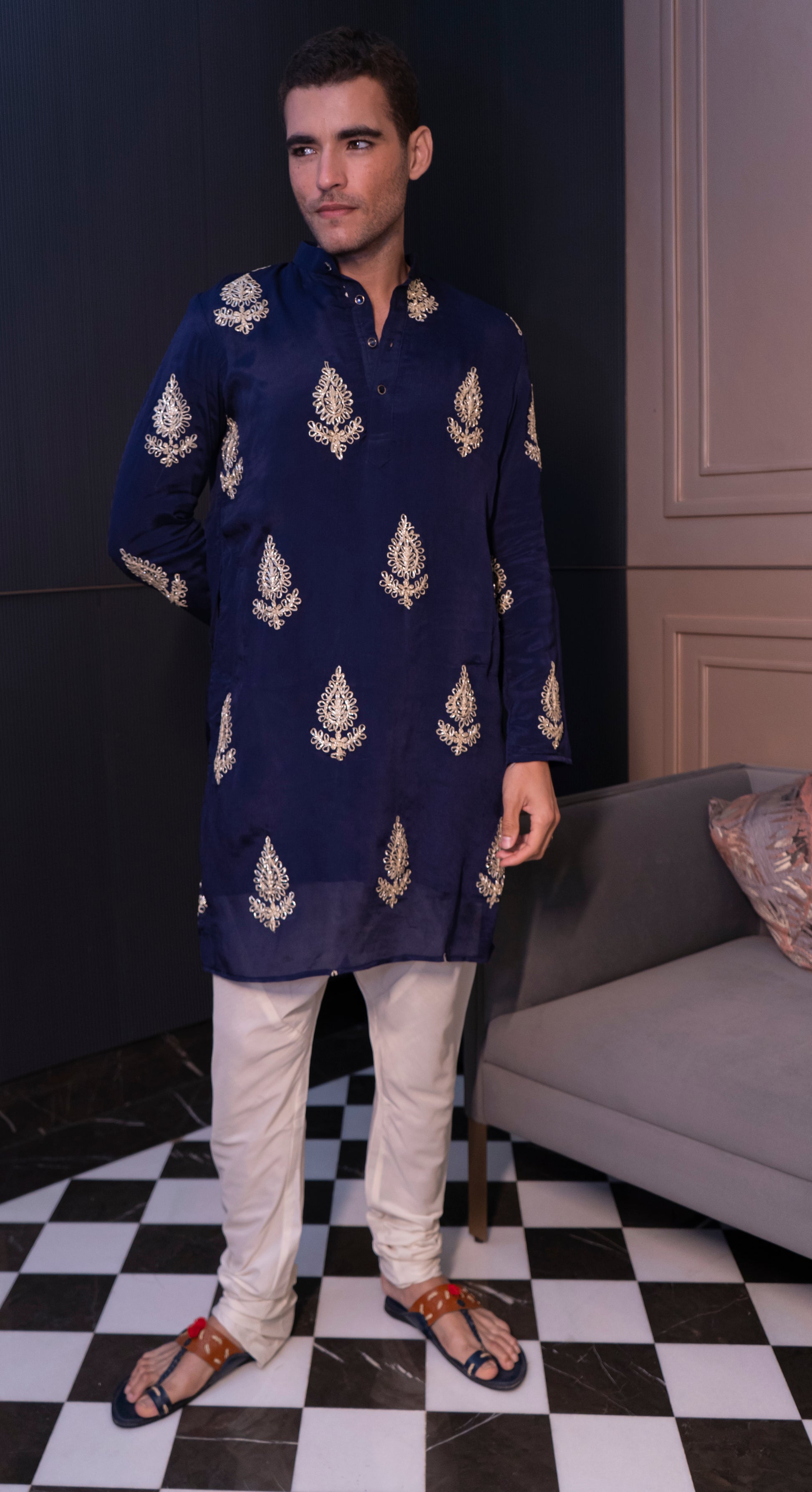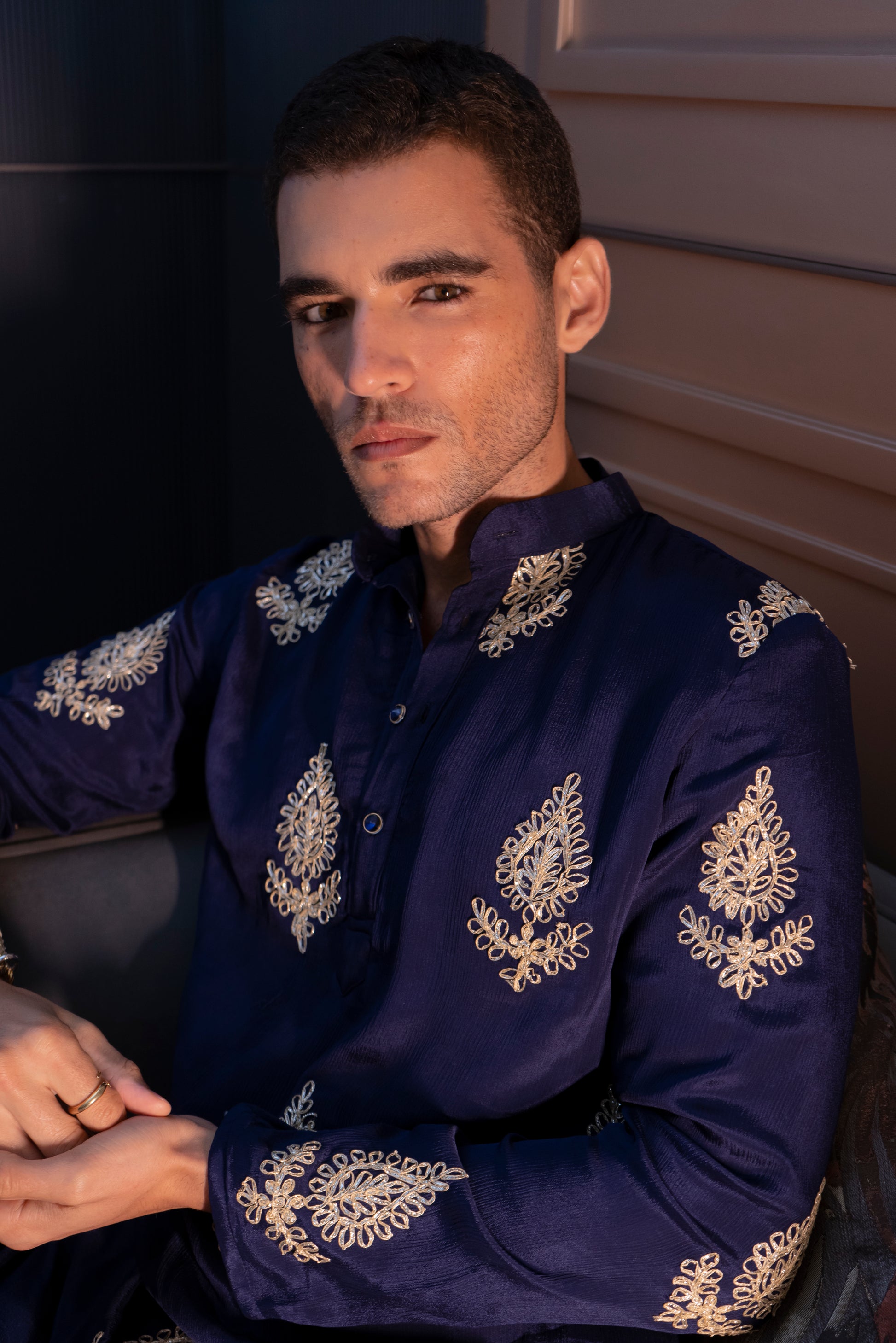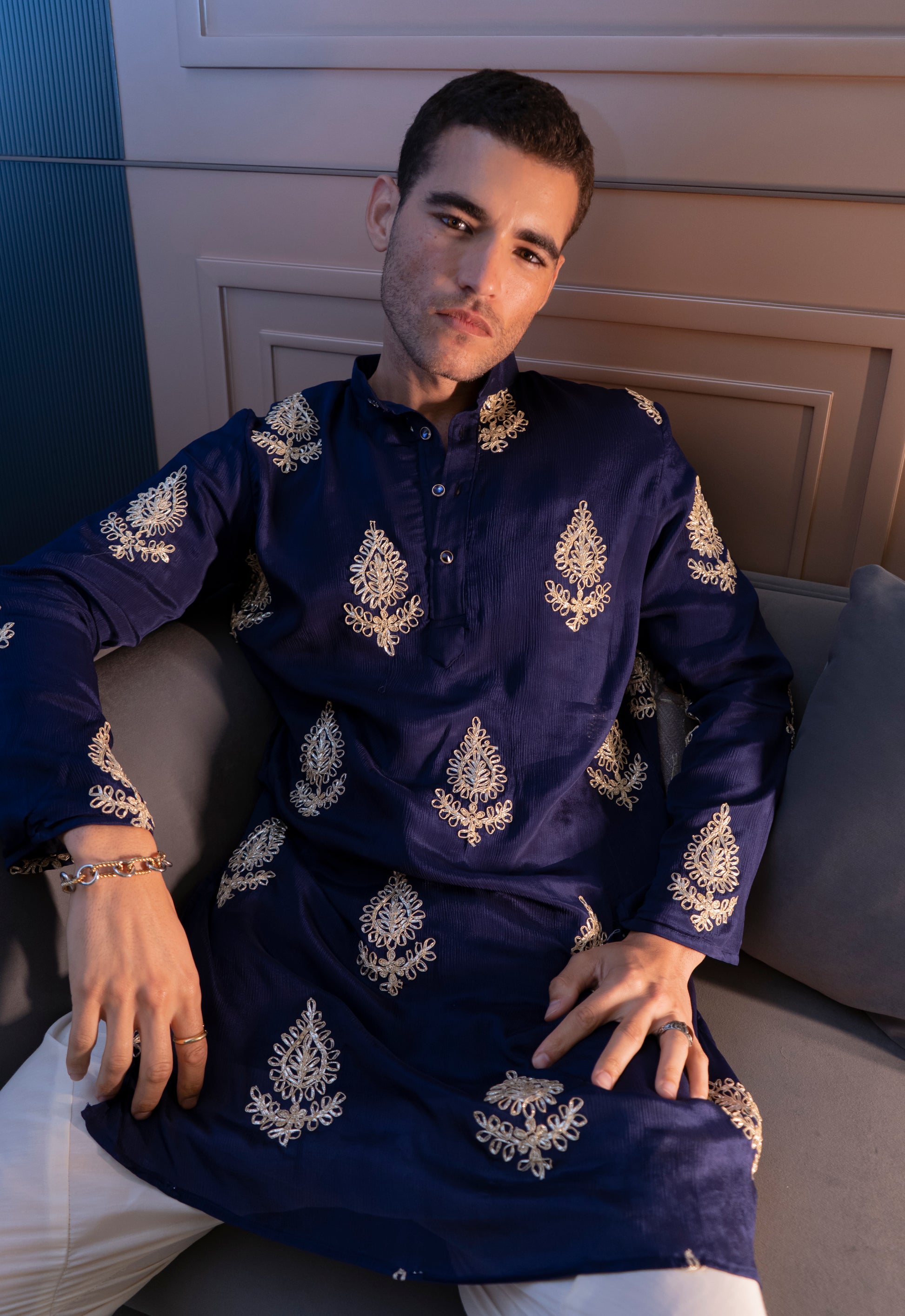 The Falak Kurta in serene blue combines elegance with traditional detailing. Crafted from lightweight chinnon georgette, it features exquisite Gotta Patti work that adds a subtle shimmer and festive charm. Flowing and breathable, this kurta is perfect for weddings, cultural events, or evening celebrations.