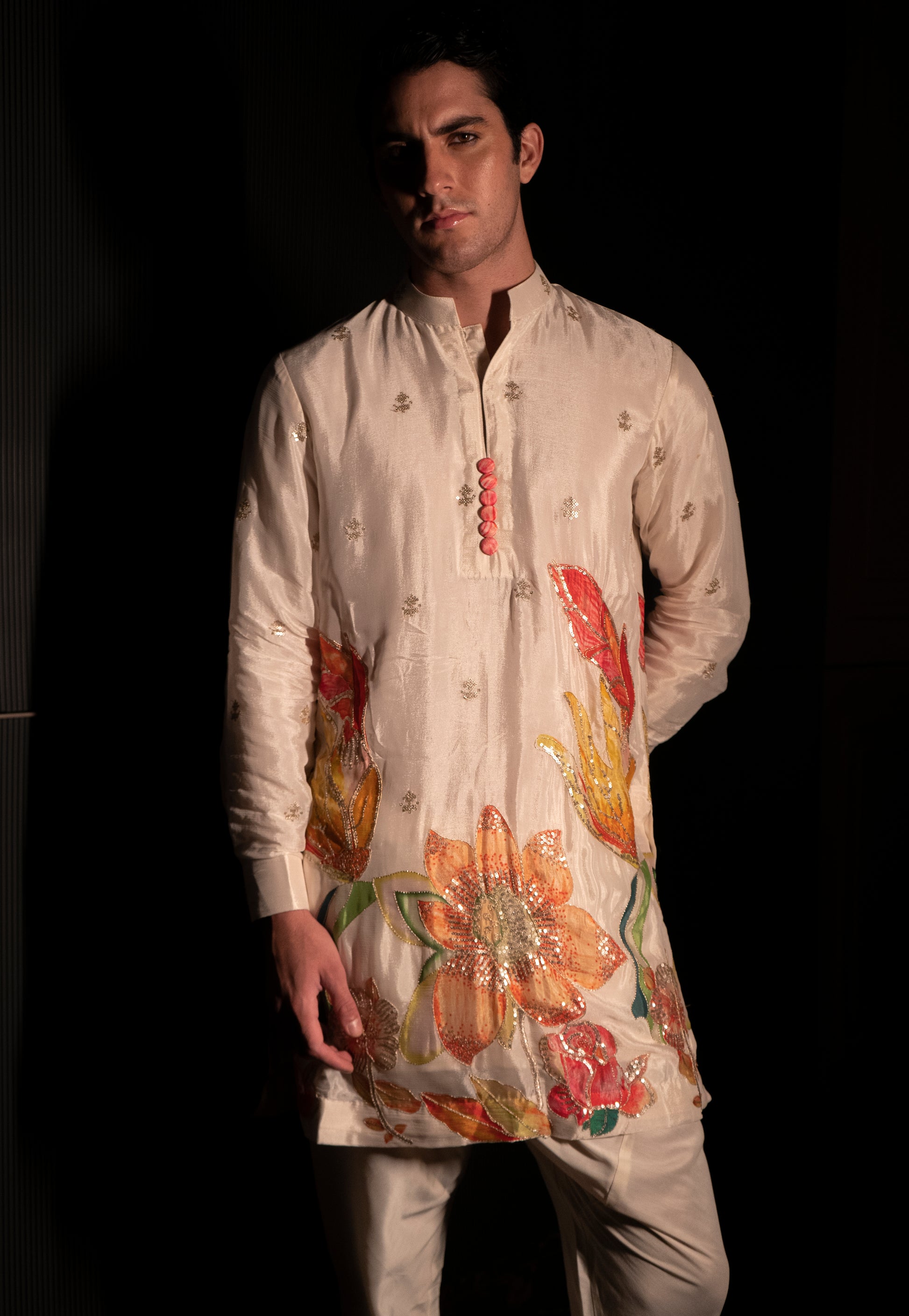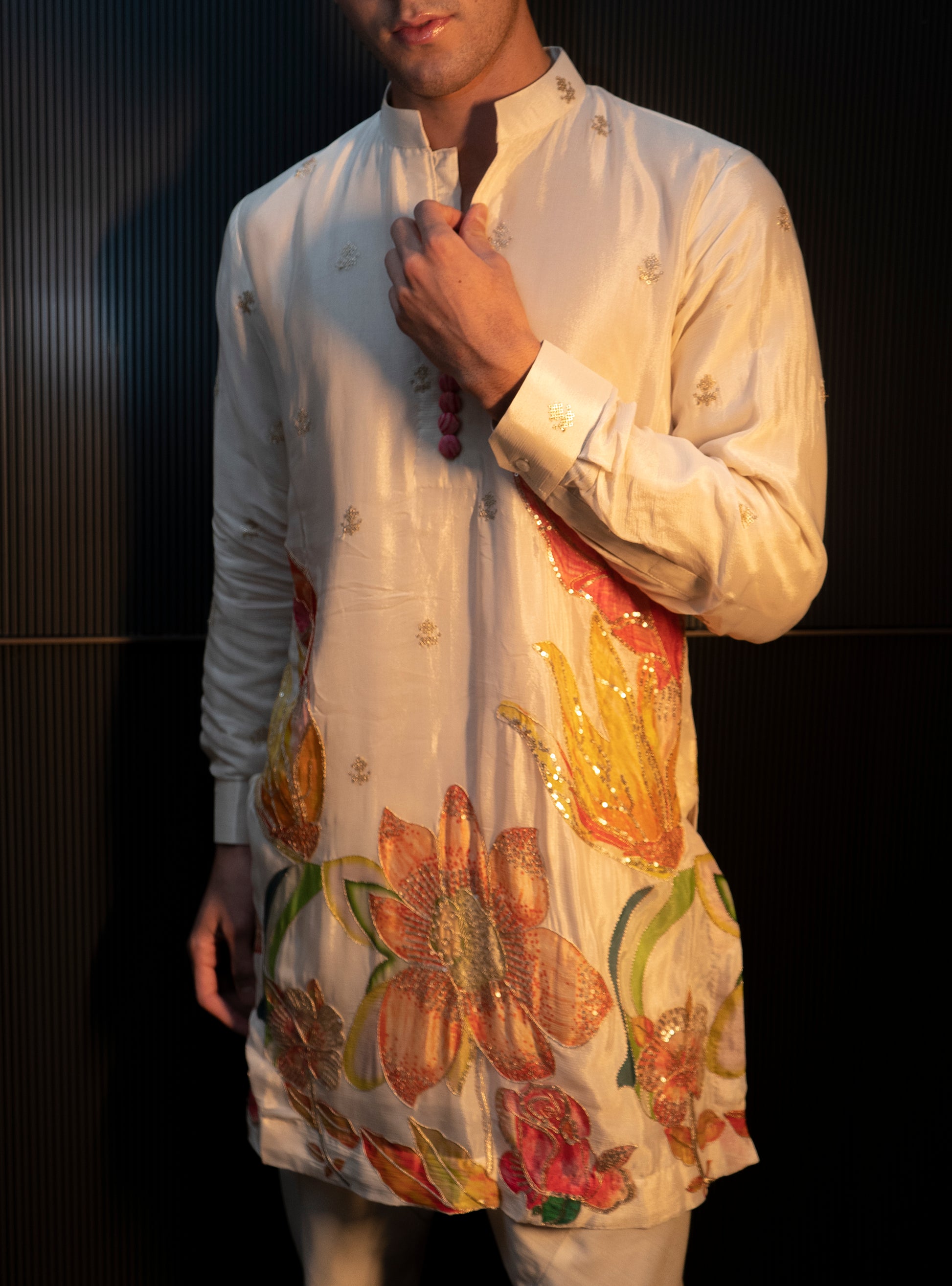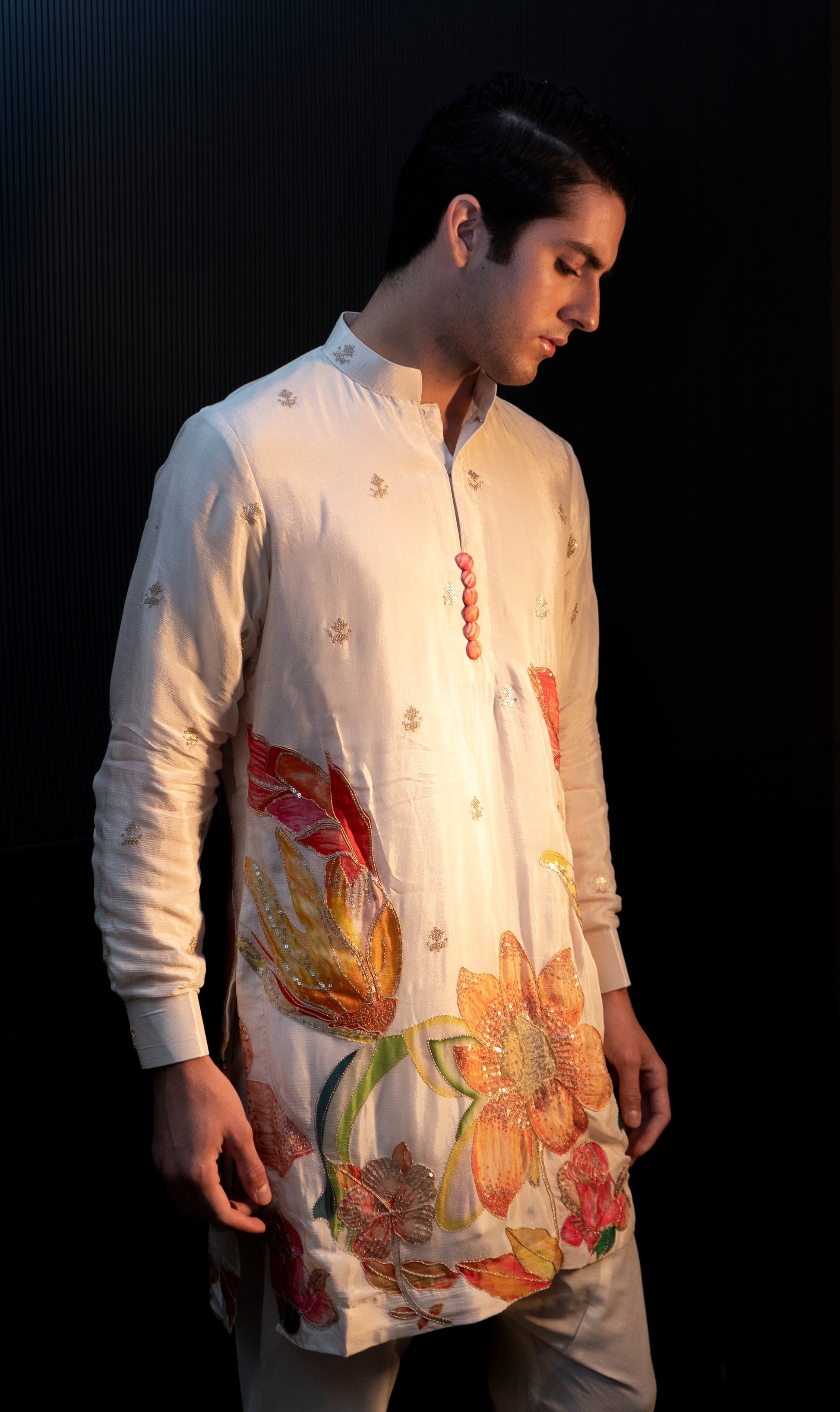 The Rangrez Kurta in white chinnon silk is a blend of traditional craftsmanship and contemporary elegance. Crafted from soft, lightweight chinnon silk, it features intricate handprint designs that bring a subtle artistic charm to the fabric. Comfortable and breathable, this kurta is perfect for festive occasions, cultural events, or casual ethnic styling.