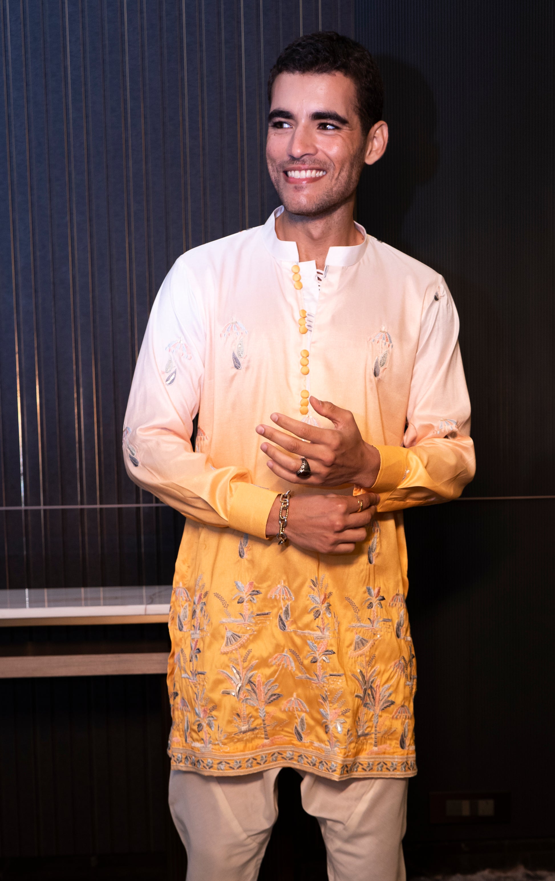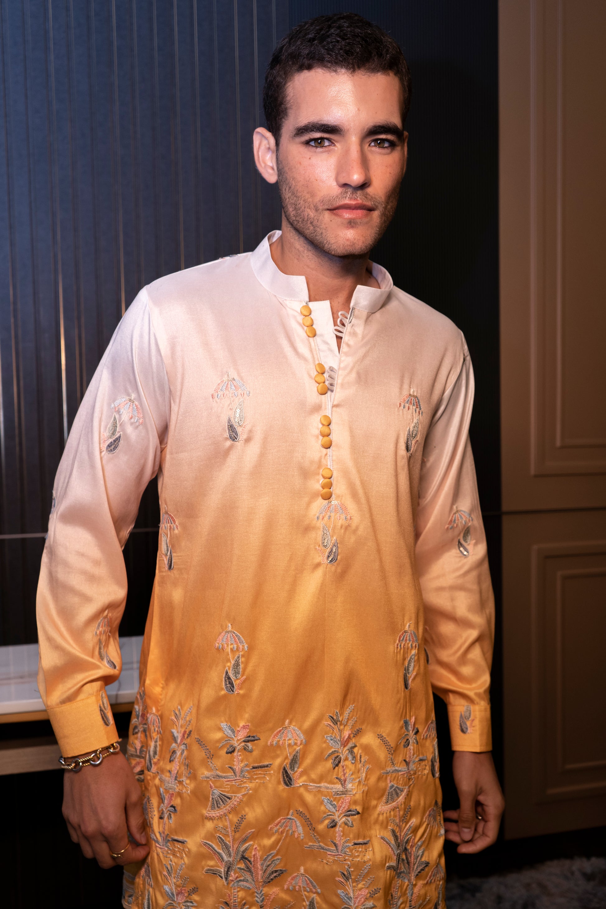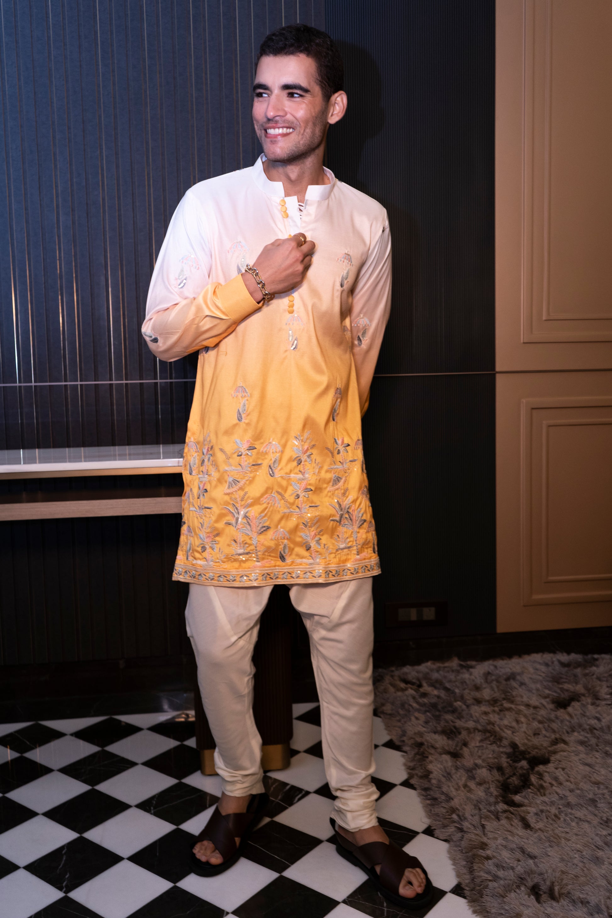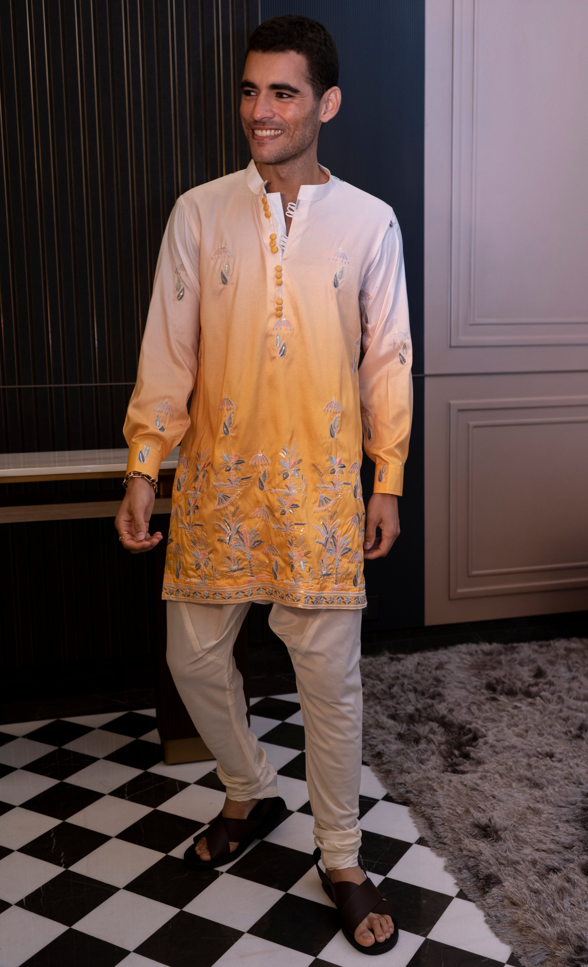 The Rangtarang Kurta in a graceful white-to-yellow ombre is crafted from soft, luxurious modal silk. Its smooth texture and flowing drape create a comfortable yet elegant silhouette, while the ombre effect adds a contemporary, eye-catching appeal. Perfect for festive occasions, casual celebrations, or daytime events, this kurta blends style with effortless comfort.